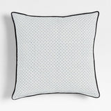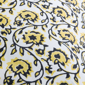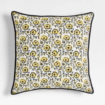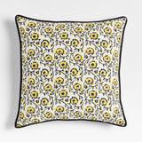 Talented artisans in rural Jaipur, India, print each of our pillows by hand, repeatedly stamping off-white cotton with a carved block to create the swirling design. Block-printed first in saffron yellow and then dark grey, the layered florals exhibit organic variations that make each pillow beautifully unique. Grey diamonds and quatrefoils pattern the reverse side, and black piping provides a crisp outline.