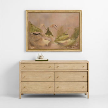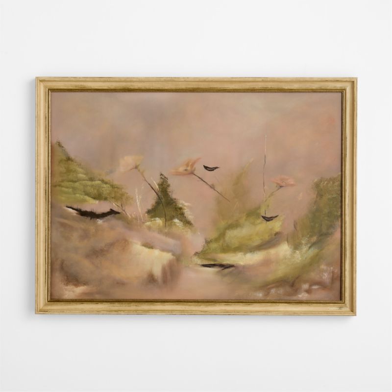 Lindsay Browning's fanciful landscape invites viewers to partake in a scene both witnessed and imagined. Freely drawn flowers, birds and greenery populate a misty setting, rendered in softly brushed and blended neutrals with a hint of blue. Our giclee print of the original acrylic painting is hand-finished with texture to give it a straight-from-the-studio appearance. A wood floater frame finished in gold lends definition to this dreamy scene.
