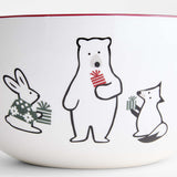 Bundled up and ready for the holidays, Joan Anderson's delightful arctic friends pose against the snow-white background of our wintry mixing bowls. The animals are illustrated in clean black lines embellished with festive pops of color: red scarves (and noses) for the reindeer, a green Fair Isle sweater on the bunny, and striped red and green Christmas gifts presented by the polar bear and fox. Handpainted red rims detail the small and large bowls, while candy cane stripes adorn the medium bowl. This set is perfect for mixing cake batter, buttercream and ganache or for presenting a trio of snacks or salads.
