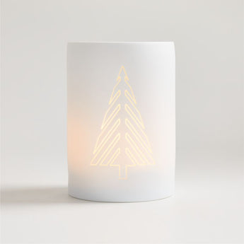 Modern and linear, a pine tree cutout provides peeks at candlelight through our matte white porcelain hurricane. A warm glow flows out of the angular cutouts, creating a wintry glow on a fireplace mantel, entryway console or buffet. Scatter or cluster the medium Christmas tree candle holder with multiples of the coordinating other sizes to create a snowy centerpiece on the holiday dining table.