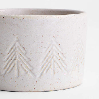 A forest of minimalist trees encircles each of the artisanal ramekins in this set. Crafted of stoneware, the individual bakers are finished by hand in subtly speckled off-white. The carved trees allow the matte glaze to pool, creating a charming snow-laden look. Our exclusive ramekins go from oven to table for a wintry presentation of artichoke dip, herb-roasted olives or Christmas morning mini quiches. Or use them to hold dried fruits, nuts and crackers on a festive cheese board.