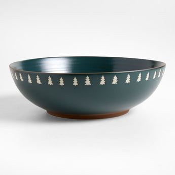 Inspired by the rustic woodlands of the Hudson Valley, a forest's worth of snow-laden evergreens encircles our Green Trees serving bowl. Charming, graphic trees created using the wax-resist process offer subtle texture and graphic contrast in creamy white against the speckled pine-green glaze. Each stoneware bowl is hand glazed by skilled artisans, with the unglazed rim and base providing a glimpse of the recycled clay for a warm, organic look. Pair the bowl with the rest of the pieces in our exclusive Green Trees dinnerware and serving collection to set a festive table for everyday winter meals as well as the Christmas feast.