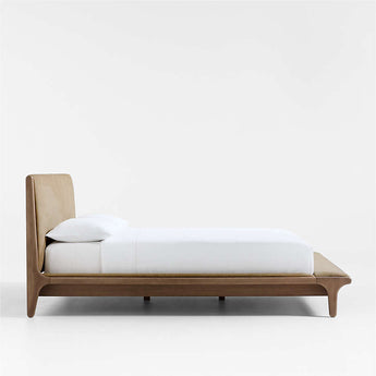 Mid-century inspiration, beautiful oak and a little something extra. Take a closer look at our Alrik bed and you'll see how the frame extends a bit farther at the foot of the bed to form a bench. The cushioned footrail, headboard and side rails are upholstered in a textural weave of heathered neutrals, complementing the streamlined solid oak frame finished in warm brown. Clean-lined yet full of subtle design details, the bed is accented with recessed panels, rounded T-shaped legs and, of course, the integrated bench.