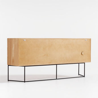 Mid-century Japanese design provides the inspiration for this eye-catching, mixed-material media console. Floating on an open, angled base of black patina-finished iron, the console showcases sustainably sourced elm and elm veneer with a natural finish. Fluting running in two directions textures the facade, enhancing the console's simple, box-like contours with linear movement. Petite conical knobs pepper the sideboard with contrast, opening three drawers and a double-door cabinet. For expanded storage, pair the media console with a coordinating bookcase or two.