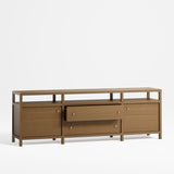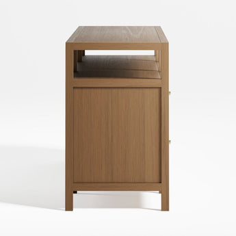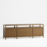 Refined and bold, Keane takes media storage to the next level. Scaled to create a stately presence in the living or family room, each large console is crafted of beautiful mahogany and meranti wood with a light driftwood finish that puts the focus on the wood. The media console flanks a central set of drawers with roomy cabinets, all styled with flat fronts and dotted with small brass-finished pulls. Channel detailing on the sides enhances the console's clean, architectural lines. Open shelving on top highlights media components, books or collectibles. Our best-selling Keane collection is a Crate & Barrel exclusive.