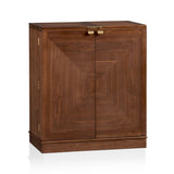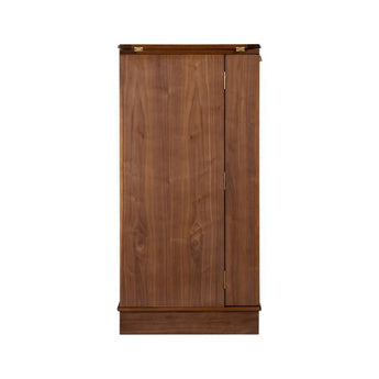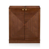 Parquet panels piece together gorgeous grain and color in this walnut bar cabinet that's ready to unfold for instant entertaining. With a flip and pull of the clean-styled brass hardware, the bar is open for business. Finished on all four sides, Maxine can float in a room. Its wood top folds out to an expanded work surface inset with black laminate. The interior is well equipped with racks for stemware, shelves for beverage bottles and a lower rack for 16 wine bottles. Open shelves and drawer box hold bar tools, ice buckets and supplies. The Maxine Bar Cabinet is a Crate and Barrel exclusive.