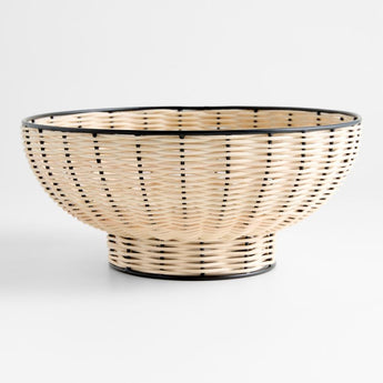 A modern take on traditional basketry, our Amira pedestal bowl showcases fresh produce, bakery rolls or a centerpiece spill of dried botanicals with breezy style. Skilled artisans weave natural rattan on a hand-welded black iron frame for graphic contrast and an eye-catching mix of materials. Pair with Amira napkin rings for a coordinated table.