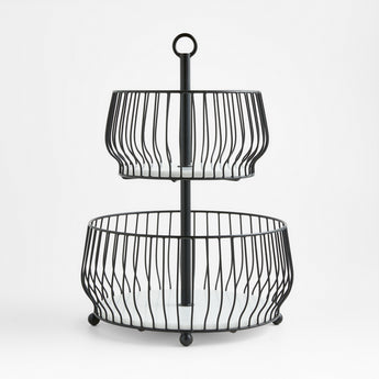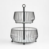 Tiered display and serving baskets are handcrafted of iron wire in a distinctive rustic "weave" and finished in a multistep process of zinc plating, dipping and rubbing to create the beautiful, dark antiqued patina.