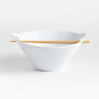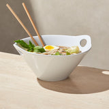 Modern Asian serving shape in white porcelain rests bamboo chopsticks in the cutout handles. The deep, conical bowl is just the thing for serving pad thai, Vietnamese beef noodle salad and cold peanut udon noodles. The handles make carrying hot meals to the table safe and painless, and the sturdy bowl is microwave- and dishwasher-safe. Serve your favorite noodle dishes into our smaller Kai noodle bowls and plates.