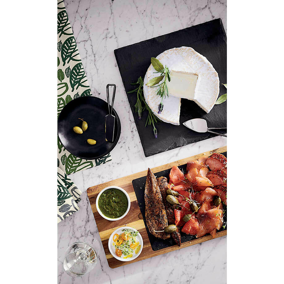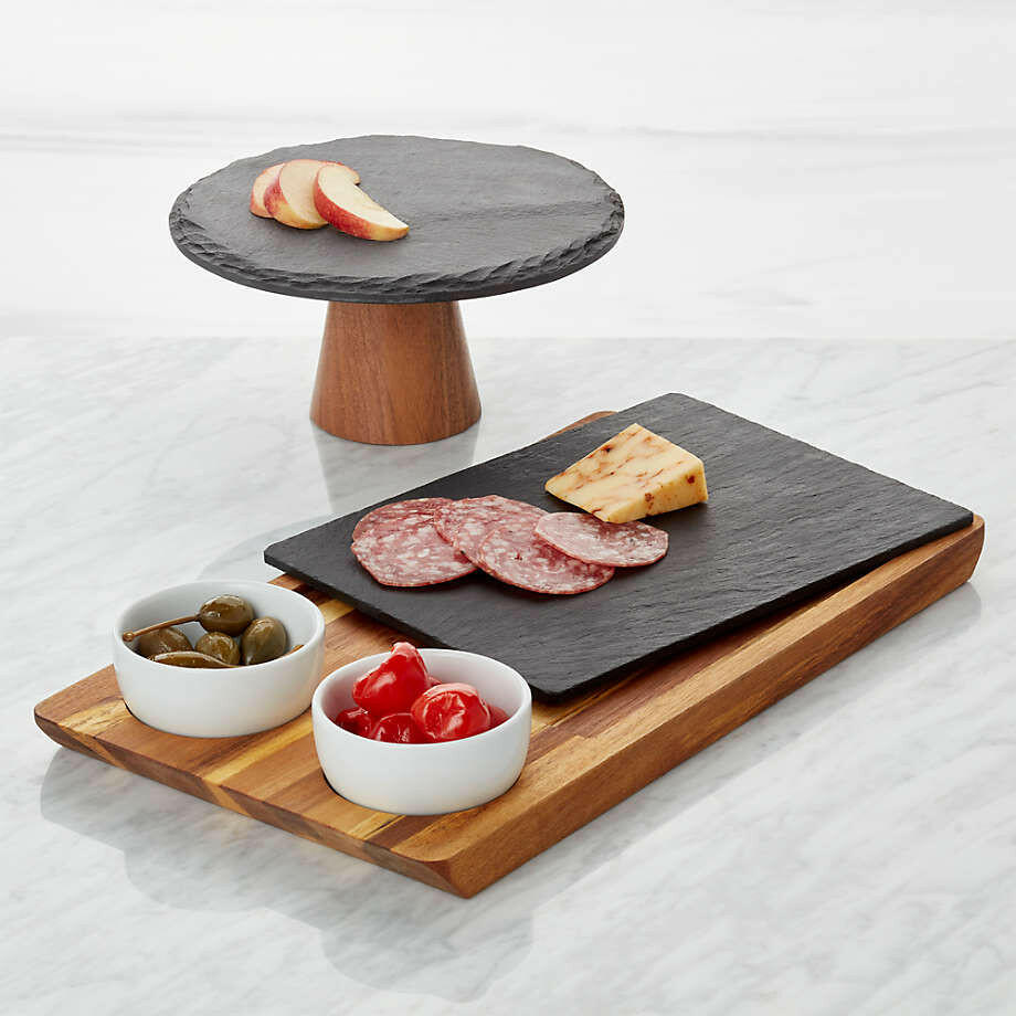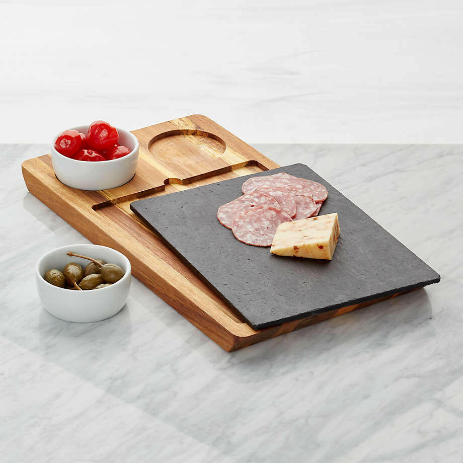 This handsome design unites warm acacia wood and cool slate in a serving board that optimizes serving options. The board serving features recessed slots for two ceramic appetizer bowls and slate board that remove to let you expand the spread and facilitate passing.View all Slate ServewareBy choosing FSC®-certified products, you are supporting responsible management of the world's forests.FSC ®-certified acacia woodSlateWipe clean with damp cloth; do not soakFeatures FSC ®-certified wood from forests that are responsibly managed to be environmentally sound and socially beneficialImported,