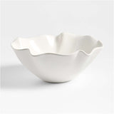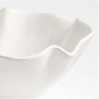 Freeform waves of ruffles and folds in high-gloss white earthenware make a big impression at the table or buffet. Group several small bowls together to hold various types of chips or fruits, or combine with our other white ruffle serving pieces to present a selection of dips, dishes and delicacies.