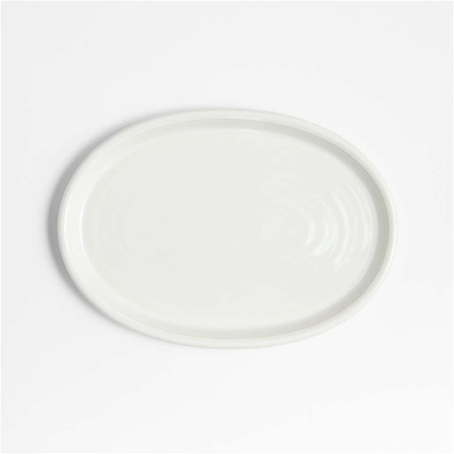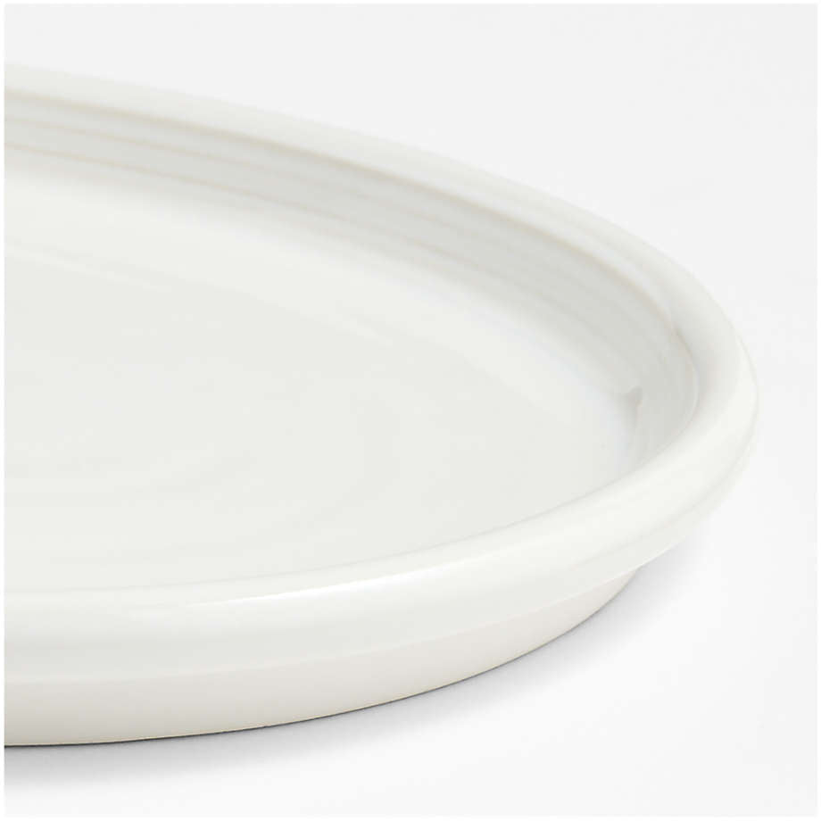 Oval-shaped to hold a sandwich and a matching soup bowl, this white plate is ribbed with the look of hand-thrown pottery. Crafted by skilled artisans in Portugal, the plate is part of our classic Farmhouse collection distinguished by its bold rims and sturdy feel.