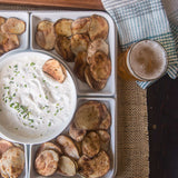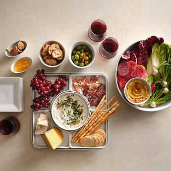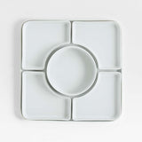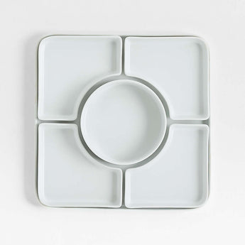Our white modular serving set includes a large serving tray, bowl and four bowls, all fitting neatly together or split up for serving any combination of chips, appetizers, veggie and dips.