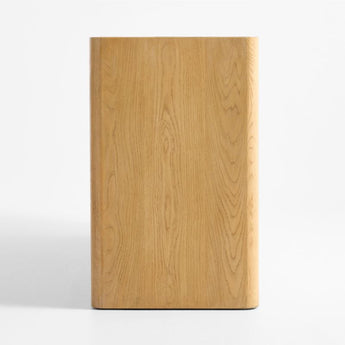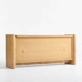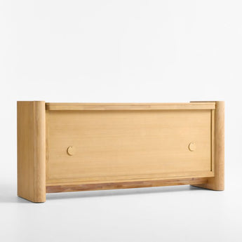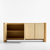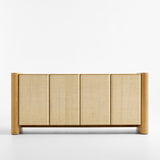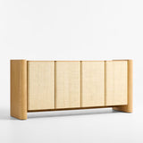 Simple materials and a minimalist design find maximum expression in our Sonoran media console. Rounded legs rise from the floor, bracketing the credenza in light-finished oak. Two flat-front cabinets float in between, wrapped in the one-of-a-kind color and texture of handwoven natural grasscloth. Finger pulls open the two double-door cabinets, each outfitted with an adjustable shelf and cord management cutouts.