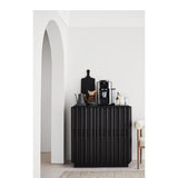 Designed with a vintage teak sculpture in mind, our Bardi cabinet delights the eye with expressive texture and architectural lines. Solid ash rods in different shapes and thicknesses wrap the cabinet, creating a seamless, sculptural look enhanced by the dark ebonized finish. Two doors open to reveal a roomy interior outfitted with two adjustable shelves. Sleek and modern, Bardi steals the show as a striking entryway piece or bar cabinet.