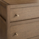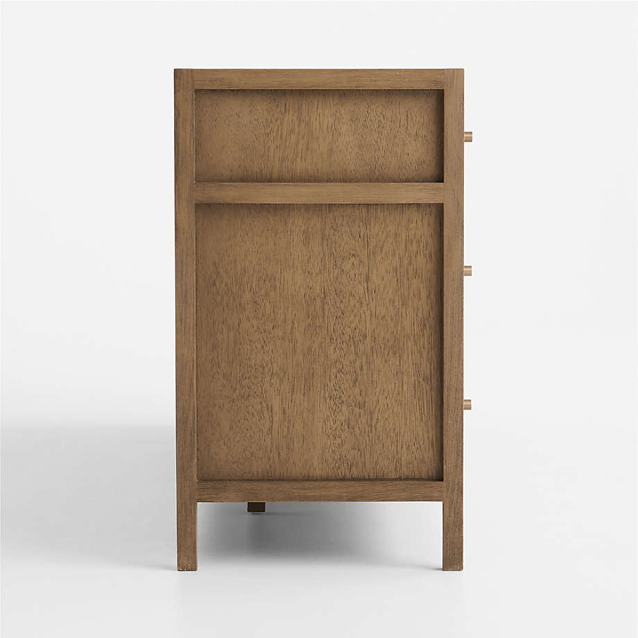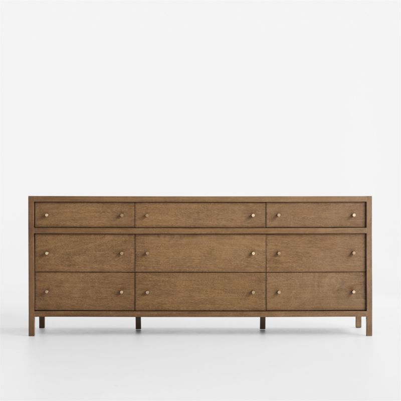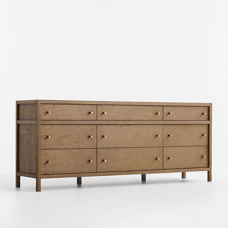 Refined and bold, Keane takes bedroom storage to the next level. Scaled to create a stately presence in the master bedroom, each piece is crafted of beautiful mahogany and meranti wood with a warm driftwood finish. Studded with warm brass round pulls, this roomy nine-drawer dresser has inset panels and channel detailing to call attention to its clean, architectural lines. Our bestselling Keane collection is a Crate & Barrel exclusive.