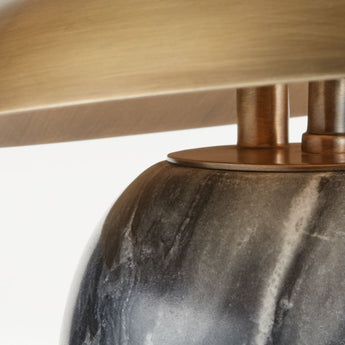 Lighting as art. A burnished brass shade floats over Formosa's handmade marble base to create an energetic, asymmetrical table lamp. Tilted dynamically, the gleaming metal shade contrasts beautifully with the organic swirls of grey, white and black that animate the stone sphere. Our Formosa stone table lamp is a Crate and Barrel exclusive. Due to the natural material, each one is unique.