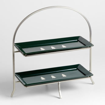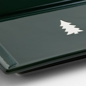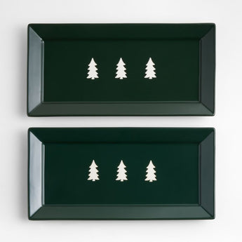Made with a wax-resist method for a durable and textural design, these delightful stoneware platters each feature a trio of white pines on a background of deep green glaze. The rectangular serving plates are detailed with frame-like edges to put the focus on freshly decorated cookies or small bites. The set of two tree platters also makes a lovely holiday gift.