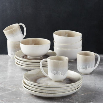 The simple, classic shape of our Caspian salad plate puts the focus on its beautiful grey reactive glaze. Undergoing chemical changes during firing, the glaze produces one-of-a-kind patterns and luminous, variable warm grey colors with taupe undertones. As it cascades down the plate, the glaze transitions from light to dark, peppered throughout with unique markings and crackles. This intentional and desirable crazing occurs during firing, and the craquelure can develop more complexity over the years whenever the raw natural materials expand and contract. The glaze and its effects are food-safe but may temporarily discolor with certain foods.
