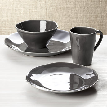 Our most coveted casual dinnerware collection recalls the warm hospitality of Portugal's quaint seaside cafes. Glazed dark grey, each free-form stoneware coffee mug is hand-antiqued at the rim by Portuguese artisans.