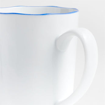 Outlined in blue, our contemporary Mercer porcelain whiteware represents a fusion of refinement and rusticity. This mug takes on organic overtones with a freeform rim and finely "hammered" surface that ripples the light. Offering crisp contrast to the snow-white glaze, the blue rim brings a classic bistro vibe to low-key breakfasts and styled brunches. Smooth enough to not harm table surfaces, the unglazed ceramic bottom gives each piece an artisanal look.