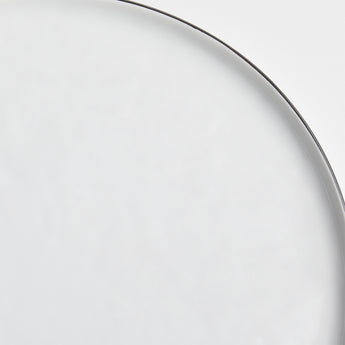 Outlined in black, our contemporary Mercer porcelain whiteware represents a fusion of refinement and rusticity. The coupe shape of this dinner plate takes on organic overtones with a freeform rim and finely "hammered" surface that ripples the light. Offering crisp contrast to the snow-white glaze, the black rim brings a classic bistro vibe to low-key meals and smart dinner parties. Smooth enough to not harm table surfaces, the unglazed bottom gives each piece an artisanal look.