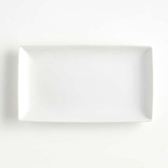 Clean coupe-shaped rectangle lays out generous portions of cheese, salumi, flatbreads, and more. A Crate and Barrel exclusive, our versatile white porcelain plate can mix with a variety of serveware and dinnerware. The oven-, microwave- and dishwasher-safe serving plate warms up appetizers and cleans up easily after dinners and cocktail parties.