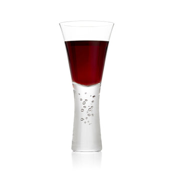 A hefty, solid sham lends gravitas to this dramatic contemporary wine glass, lightened by an uplifting play of random bubbles. Master glassworkers use a special tool to make cavities in the molten glass that trap air bubbles to give the glass its bubbly look. This handmade glass, a Crate and Barrel exclusive, appears delicate but is dishwasher-safe. For a unified cocktail hour, pair with the other pieces in our Verve barware collection. Due to their handcrafted nature, each one will be subtly unique.