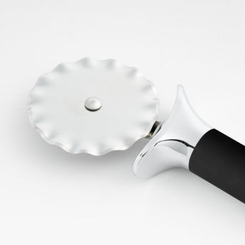 Cut pastry and fresh pasta with a bit of flair. This fluted pastry wheel quickly and easily cuts sheets of rolled-out pastry dough or fresh pasta with a decorative border. Mirror-polished stainless steel shapes the sleek pastry cutter, and the soft-touch cylindrical handle provides a sturdy, comfortable grip. We love the way the refined beveled edge finishes the black handle with a dynamic detail. Combine with the other pastry tools in our exclusive Crate & Barrel collection for a well-outfitted workspace that's up to any baking challenge.
