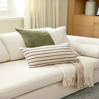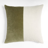 Two colors and two fabrics tempt the touch in our Ska colorblock pillow. The dual-textured design divides the square pillow in half, devoting one side to the plush luxury of khaki-green cotton velvet and the other to the slubby feel of natural linen. Our exclusive green colorblock pillow includes your choice of a plush feather or lofty down-alternative insert.