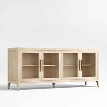We've translated the refined elegance of our popular Clairemont accent tables into a storage collection made of beautifully grained oak. Standing on tapered legs, the clean-lined media console features neat mitered corners and recessed panels on the top and sides. Brass-finished pull handles with distressed leather wrapping provide access to the two glass-paned cabinets, each with an adjustable wood shelf. A light driftwood finish with ivory cerusing highlights the wood's beautiful cathedral graining.