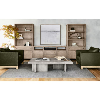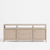 Refined and bold, Keane takes media storage to the next level. Scaled to create a stately presence in the living or family room, each piece is crafted of beautiful mahogany and meranti woods with a natural rustic finish that puts the focus on the wood. The media console flanks a central set of drawers with roomy cabinets, all styled with flat fronts and dotted with small brass-finished pulls. Channel detailing on the sides enhances the console's clean, architectural lines. Open shelving on top highlights media components, books or collectibles. Our best-selling Keane collection is a Crate & Barrel exclusive.