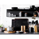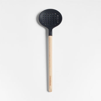 Stir, scoop and serve dumplings, pasta and peas with our signature black silicone and wood slotted spoon. Constructed with a nylon core for strength, the silicone head ably handles boiled potatoes and pot roast, while the grid of perforations allows liquids to drain away. Soft-touch silicone won't damage non-stick pans and resists stains, scratches and heat up to 600 degrees. Natural beechwood shapes a sleek cylindrical handle for a sturdy grip and a warm, classic look. We love the way the refined beveled edge finishes the elongated handle with a dynamic detail. Combine the black slotted spoon with the other exquisitely proportioned utensils in our exclusive Crate & Barrel collection for a well-outfitted workspace that's up to any cooking challenge.