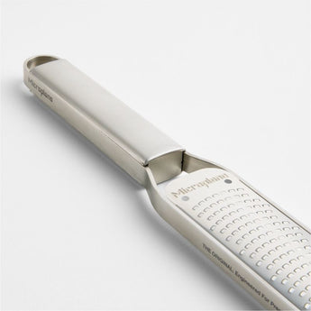 Microplane's new Professional Best series elevates the company's rightfully revered graters with thoughtful design details and all-stainless steel construction. The ultrasharp grating head remains as durable and precise as ever, while the upgraded stainless steel handle with a matte chrome finish looks modern and elegant. Use this fine grater to effortlessly cut—not rip or tear—garlic, lemon zest, nutmeg and more.