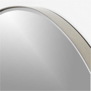Edged with a slim brushed nickel band, this minimalist and modern wall mirror curves an elegant circle. A Crate & Barrel exclusive, its reflective beveled glass creates a subtle series of concentric circles with delicate appeal. With its silver-finished stainless steel frame, the round wall mirror is an understated essential in the bedroom, bathroom or stairway landing. Arrange with our Edge arch, capsule, and rounded rectangle floor and wall mirrors in gunmetal, brushed nickel and brass to create an intriguing geometric display.