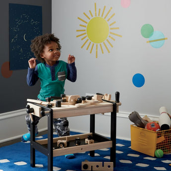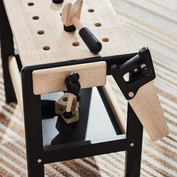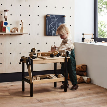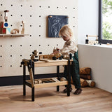 Los niños pueden realizar sus proyectos de bricolaje con la ayuda de nuestro banco de trabajo de madera de juguete y juego de herramientas. Incluye un martillo, una sierra, una llave inglesa, un destornillador y una regla de madera. Además, incluye piezas de ferretería y bloques que se pueden encajar para crear creaciones personalizadas. El banco de trabajo infantil también cuenta con un estante inferior y un compartimento lateral para guardar todo, además de una superficie superior con agujeros para los tornillos. Perfecto para pequeños constructores a partir de tres años, es un juego imaginario esencial para todas esas tareas de bricolaje.