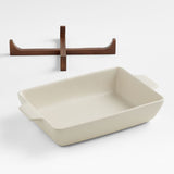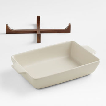 Nuestra fuente de estilo sencillo permite hornear guisos o tartas y luego se guarda en su discreto soporte de madera para servir en la mesa. Esmaltada a mano en un tono cremoso inspirado en el lino, esta fuente rectangular y profunda de cerámica es perfecta para lasaña o guisos. El salvamanteles de madera de acacia con acabado en nogal tiene forma de cruz y rebordes elevados para asegurar la fuente y proteger las mesas y mostradores.