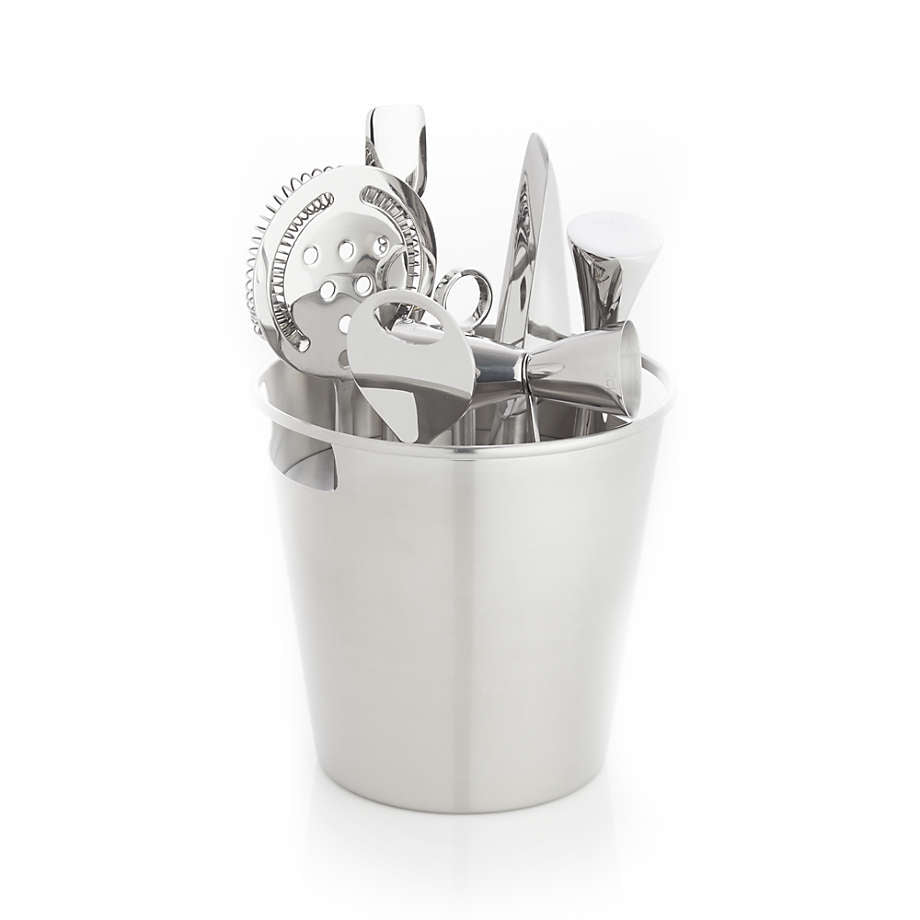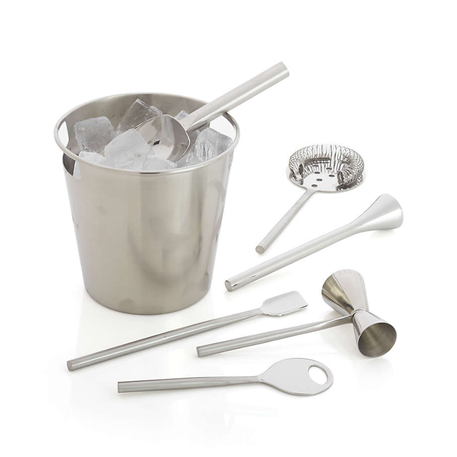 Un impresionante acabado en cobre agrega calidez a nuestro juego de herramientas de barra de acero inoxidable, su kit completo para preparar cócteles. Con un estilo limpio y contemporáneo, el juego consta de una cubitera grande para hielo y herramientas de barra con mango de cobre que incluyen un abridor de botellas, un medidor en dos tamaños, una cuchara larga con punta de pala, un colador clásico con resorte, una práctica pala para hielo y un mortero de aspecto moderno para elaborando cócteles a la antigua, julepes de menta o cócteles artesanales. Acero inoxidable 14/1 con acabado cobre y acabado en laca transparente. Lavado a mano: evitar limpiadores abrasivos.