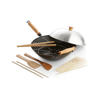 - El juego incluye: wok, tapa, palillos de bambú para cocinar, rejilla para cocinar al vapor, rejilla para tempura, pinzas de bambú de 12", espátula de bambú de 12", 6 pares de palillos de bambú, paleta de arroz de bambú y libro de cocina.