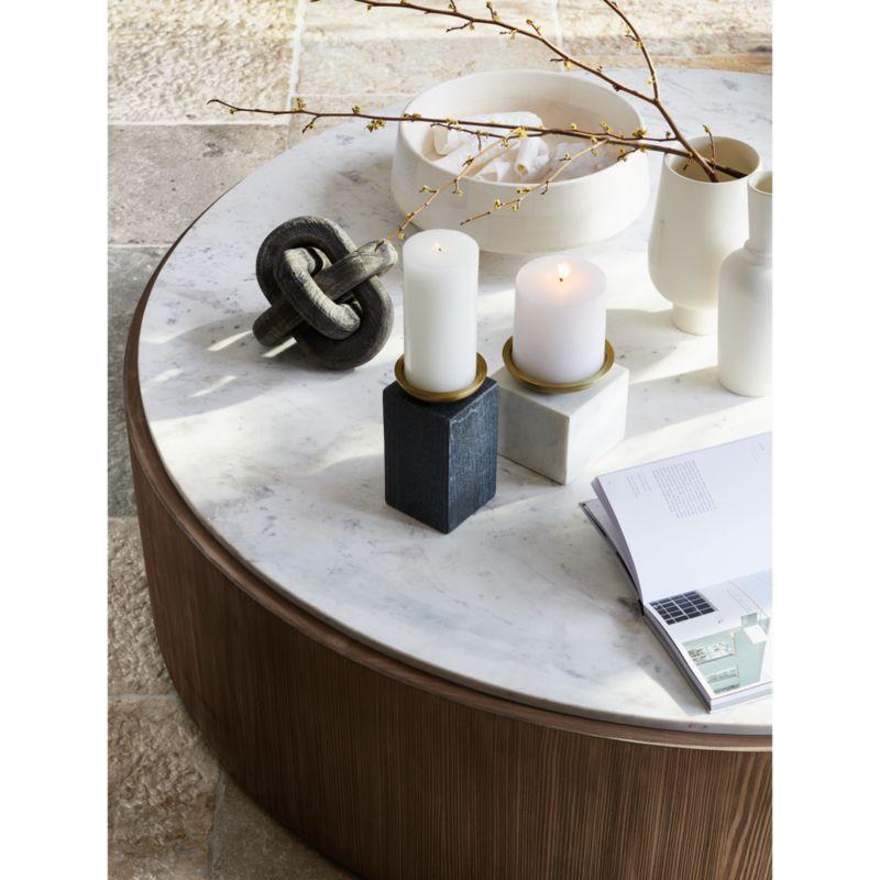 A wash of white emphasizes the parquet grain of our mango wood centerpiece bowl for a rustic modern look. Elevated on a low pedestal, the bowl angles in to present seasonal botanicals or entryway essentials. Skilled artisans carve each bowl by hand, creating a staggered pattern of wood grain. A Crate & Barrel exclusive, our Katin white wood centerpiece bowl pairs well with its larger black counterpart.