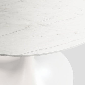 Nero reinterpreta el modernismo de mediados de siglo, combinando metal y mármol en un diseño vanguardista. Con un acabado blanco mate, la base metálica se extiende sobre un esbelto pedestal en forma de trompeta que sostiene un hermoso mármol blanco redondo. Nos encanta el diseño versátil y monocromático de la mesa de comedor, realzado por las vetas únicas y las sutiles variaciones de color del mármol natural. Ideal para espacios reducidos, nuestra exclusiva mesa con pedestal Nero tiene capacidad para cuatro personas.