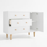 Clean lines, elevated paneling and a classic white finish: We're here for it. Largely inspired by Scandinavian farmhouse design, our Finn kid's furniture collection blends rustic charm and modern minimalism without skipping a beat. Detailed with legs and knobs in a natural finish, the tonal simplicity makes perfect sense in a nursery but can easily translate into big kid-approved styles as they grow. In addition to three drawers that keep clothes and linens neatly tucked away, the paneled door opens to reveal even more storage with a spacious cubby and removable shelf inside.