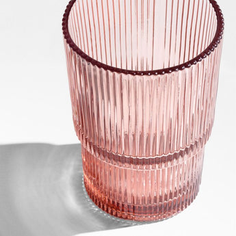 Brillantes niveles de vidrio acanalado conforman un vaso alto ideal tanto para tragos informales como para brindis formales. De un llamativo color rosa translúcido, este vaso apilable presenta una superficie estriada que capta la luz y proporciona un agarre firme. Su tono rosa de inspiración primaveral combina a la perfección con las demás piezas de nuestra exclusiva colección de bebidas Atwell.