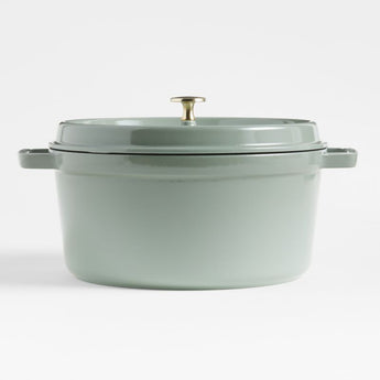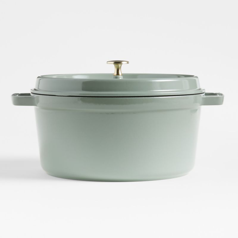 Cook, bake and serve a feast in this generously proportioned Dutch oven that goes effortlessly from stove to oven to table. Made of cast iron finished with a eucalyptus-inspired glaze exclusive to Crate & Barrel, the pot cooks evenly and efficiently and its light grey-green enamel coating resists chipping. Staub's signature matte black interior excels at braising, roasting and caramelizing and is scratch resistant and easy to clean. To ensure moist and flavorful results, the spiked lid is designed to create a rain-forest effect that returns juices back on the food, providing continuous, natural basting. A gold-finished knob adds a final gleaming touch of glam. The round cocotte accommodates large recipes, making it ideal for family dinners, dinner parties and holiday gatherings,
