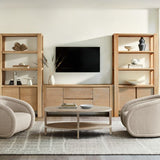 We've translated the refined elegance and Art Deco roots of our popular Clairemont into beautifully grained oak. The table's elongated oval profile, airy two-tiered design and clean tapered lines are perfect for showcasing the oak's dramatic cathedral graining, brought to full expression with wirebrushing and an ivory ceruse finish. The Clairemont oval wood coffee table is a Crate & Barrel exclusive.