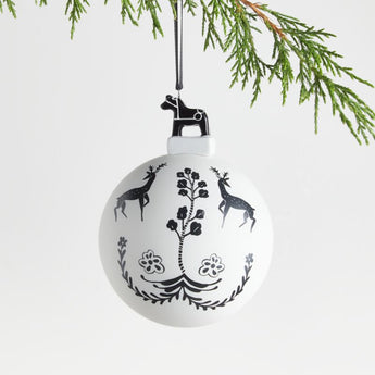 - Folkloric flourishes and a pair of prancing reindeer rendered in black decorate our Scandinavian-inspired matte white ball ornament