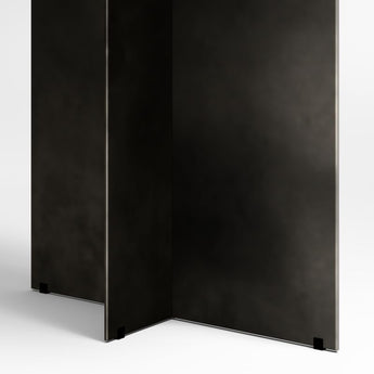 Preto cautiva con sus líneas robustas y una innovadora combinación de materiales. Los planos ingleteados de acero ennegrecido realzan la verticalidad, entrecruzándose para formar las patas en forma de X de la consola. Un tablero rectangular de fresno complementa la estética moderna e industrial con un acabado ebonizado, mientras que los bordes acolchados contrastan con suaves curvas. Aumente el impacto de Preto añadiendo la mesa de centro o auxiliar a juego (se vende por separado).