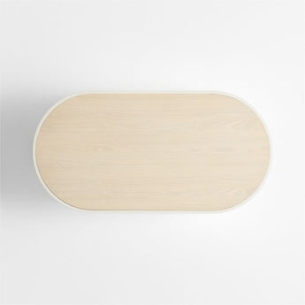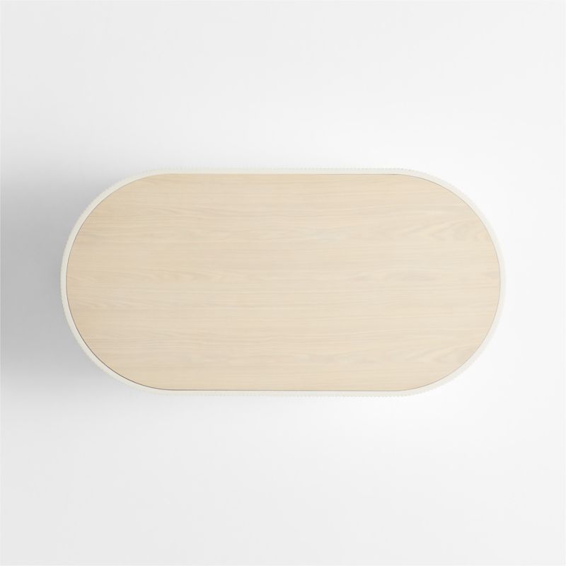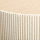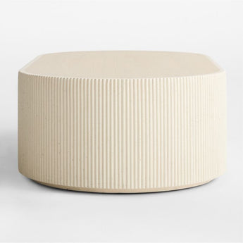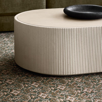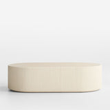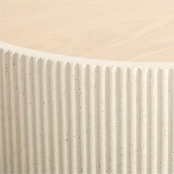 Our statement-making Kahn coffee table livens up your living space with clean, sculptural design. Shaped with a bold racetrack profile, the table showcases the textured and pitted character of off-white concrete cast with a ribbed pattern to make an intriguing play of light and shadow. The inset wood top has a light finish that complements the natural wood grain for the perfect mix of materials.