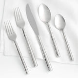 La fusión de generaciones aporta una nueva forma contemporánea al clásico acabado martillado. Los cubiertos de acero inoxidable, con elegantes cabezas y mangos redondos martillados, están pulidos a espejo.