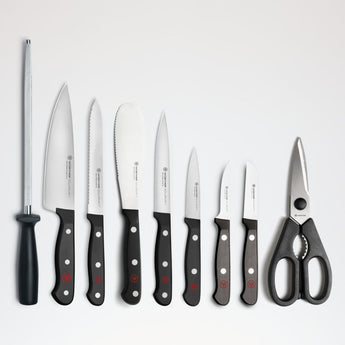 One of the most trusted names in cutlery, Wüsthof offers the perfect classic knife for every cutting, chopping and slicing job. A strong, long-lasting blade that is precision tapered from bolster to tip will maintain its shape and hold its edge. Wüsthof knives feature high-impact synthetic handles that are comfortable to hold, more durable and sanitary than wood. This set includes a 2¾-inch paring knife, 2¾-inch trimming knife, 3-inch spear-point paring knife, 4½-inch utility knife, 5-inch serrated utility knife, 5-inch spreader, 6-inch cook's knife, 9-inch sharpening steel and come-apart kitchen shears in a 15-slot acacia knife block with room to spare.